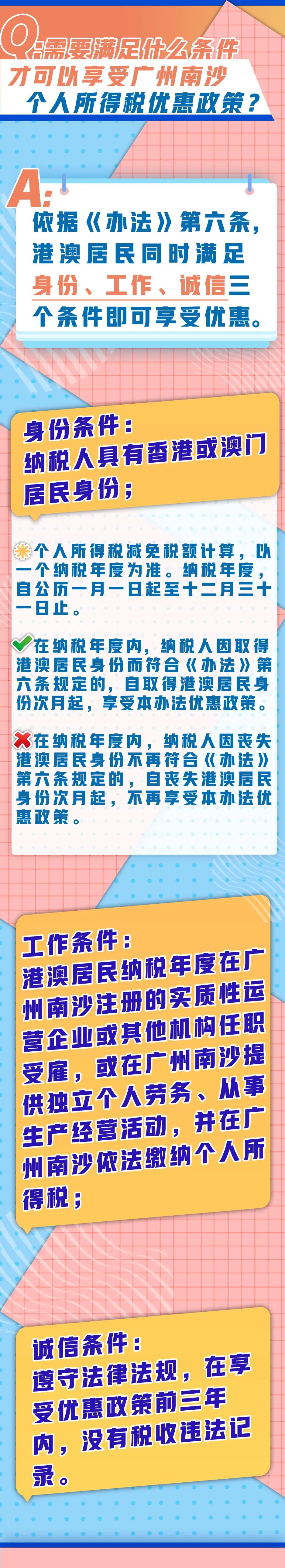 《办法》共16条,明确对在广州南沙工作的香港居民,其个人所得税税负超过香港税负的部分予以免征;对在广州南沙工作的澳门居民,其个人所得税税负超过澳门税负的部分予以免征,减免税额的计算以一个纳税年度为准。