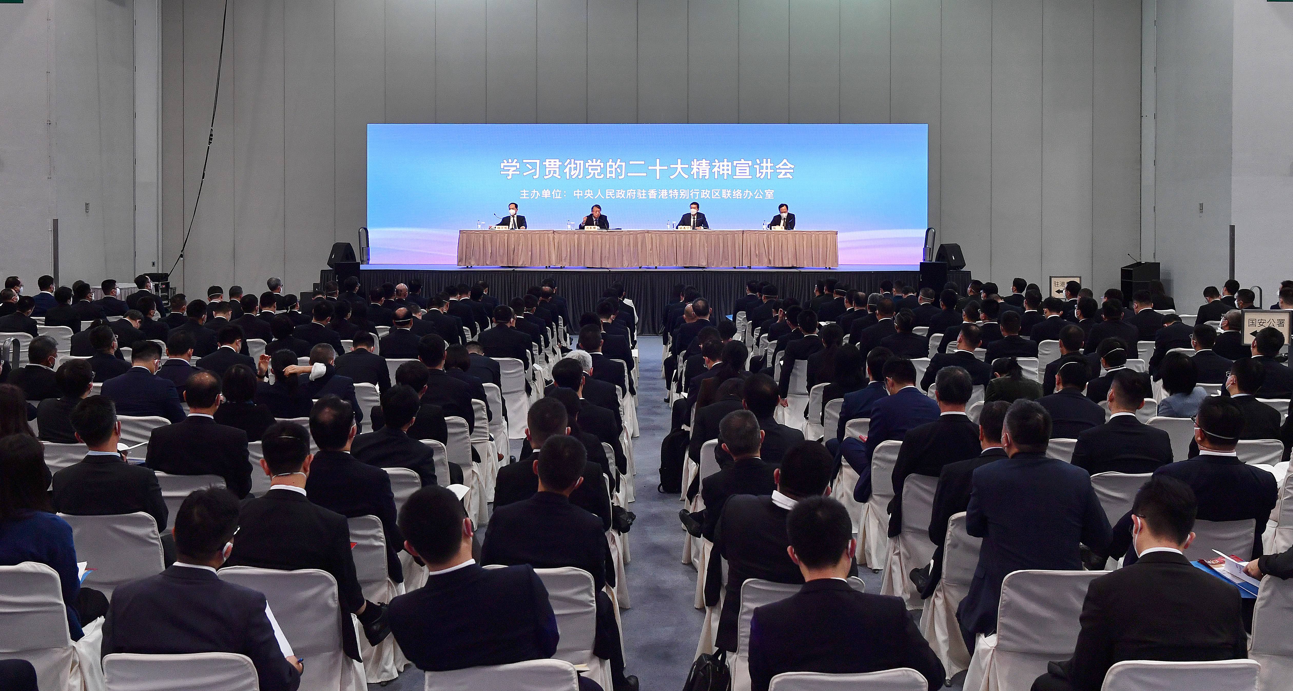 骆惠宁在主持讲话中指出,中央宣讲团来港宣讲,充分体现了以习近平同志为核心的党中央对香港“一国两制”事业的高度重视,对中央驻港机构、中资企业的亲切关怀。沈春耀主任的精彩宣讲,对于我们进一步加深对二十大精神的领悟,把思想和行动统一到二十大部署要求上来,把学习宣传贯彻工作更好引向深入,具有重要引导和促进作用。要以此次中央宣讲为契机,进一步贯彻落实好习近平总书记关于“全面学习、全面把握、全面落实”的重大要求,把学习宣传贯彻二十大精神与深入贯彻落实习近平总书记7月1日在港重要讲话结合起来,把总体把握二十大战略部署与推进“一国两制”实践结合起来,把发挥中央驻港机构带头作用与激发社会各界主动性结合起来,学深悟透,学以致用,把学习宣传贯彻二十大精神的成果,转化为扎实推进自身工作的实际行动,进一步激发建设香港、贡献国家的强大正能量。