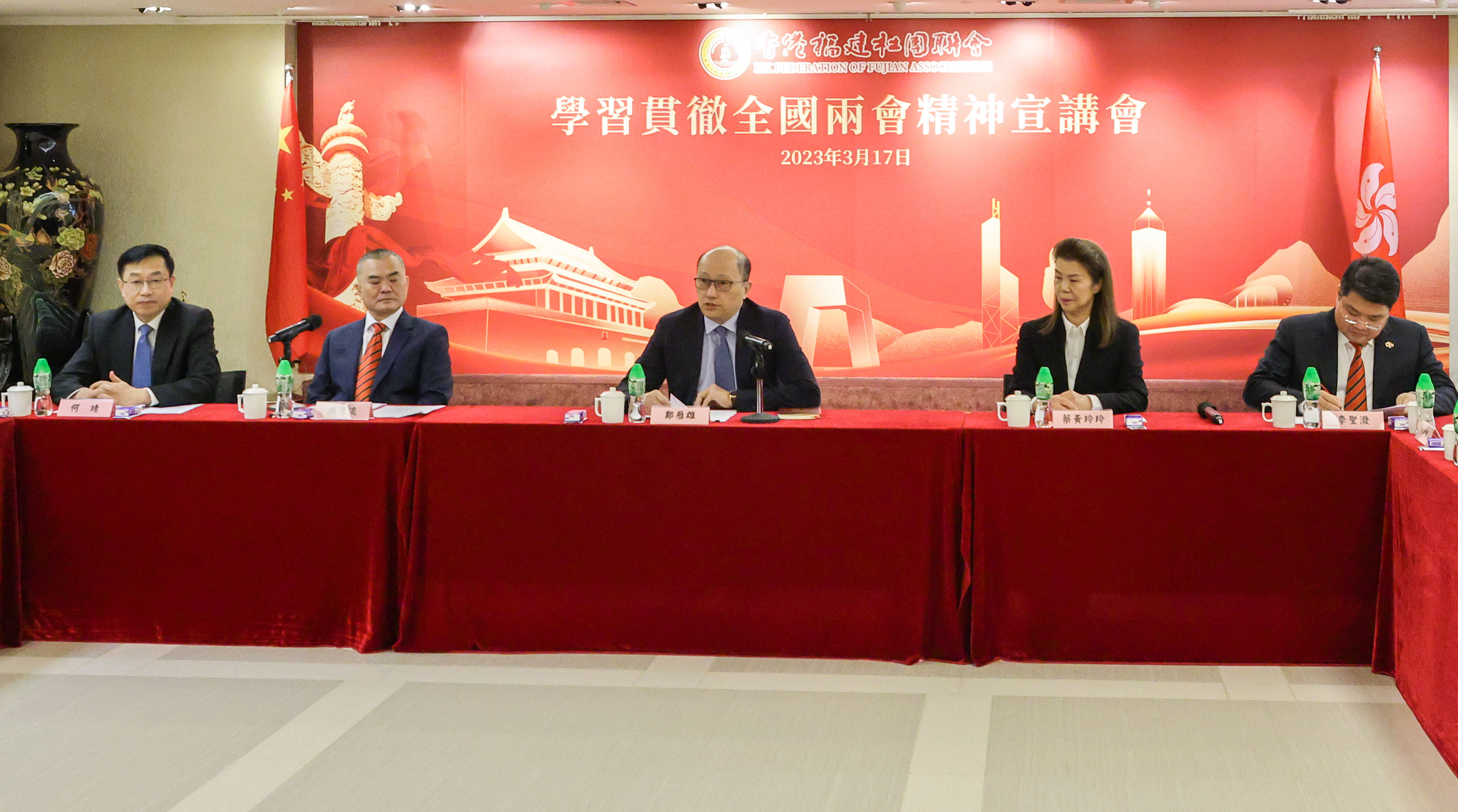 本网讯 3月17日,香港广东社团总会和香港福建社团联会分别举行“学习贯彻全国两会精神宣讲会”。中央政府驻港联络办主任郑雁雄应邀出席并作交流分享。香港广东社团总会主席龚俊龙、香港福建社团联会主席施清流分别主持宣讲会,我办副主任何靖以及近60名同乡社团骨干、基层代表参加。