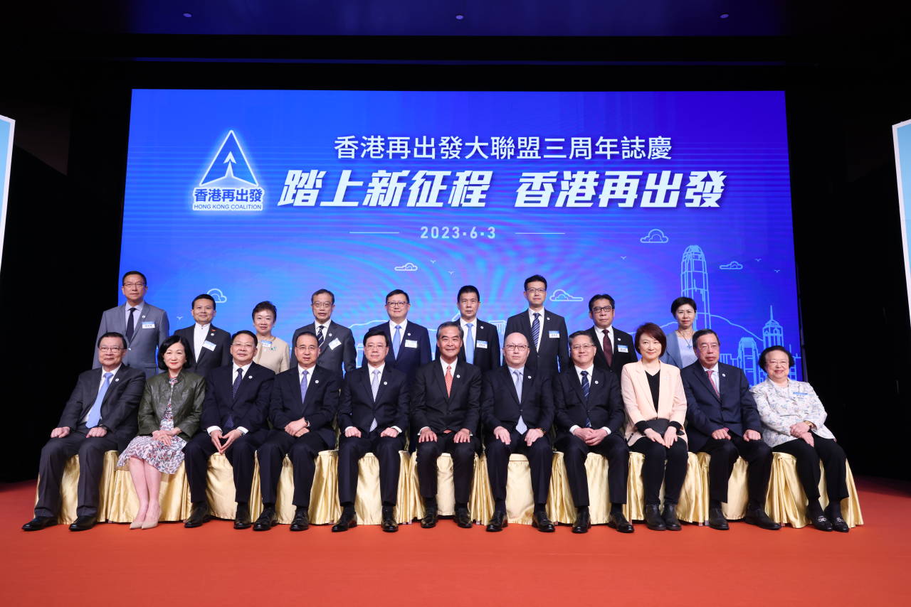 本网讯 6月3日,香港再出发大联盟三周年志庆“踏上新征程 香港再出发”酒会在香港会展中心举行。全国政协副主席、香港再出发大联盟总召集人梁振英,香港特区行政长官李家超,中央政府驻港联络办主任郑雁雄,香港再出发大联盟秘书长谭耀宗等出席并致辞。