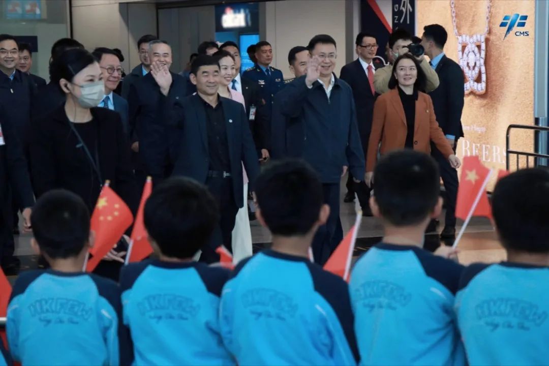 11月28日中午,香港特区政府在机场举行了热烈的欢迎仪式。中国载人航天工程办公室副主任、代表团团长林西强,执行空间站建造任务的神舟十二号乘组、神舟十三号乘组、神舟十四号乘组、神舟十五号乘组航天员代表刘伯明、王亚平、陈冬、张陆率先步出机场大厅。香港特区政府政务司司长陈国基、民政及青年事务局局长麦美娟等政府官员到机场迎接。百余名香港小学生们在现场挥舞着五星红旗和紫?;ㄇ?,热情欢迎代表团的到来。