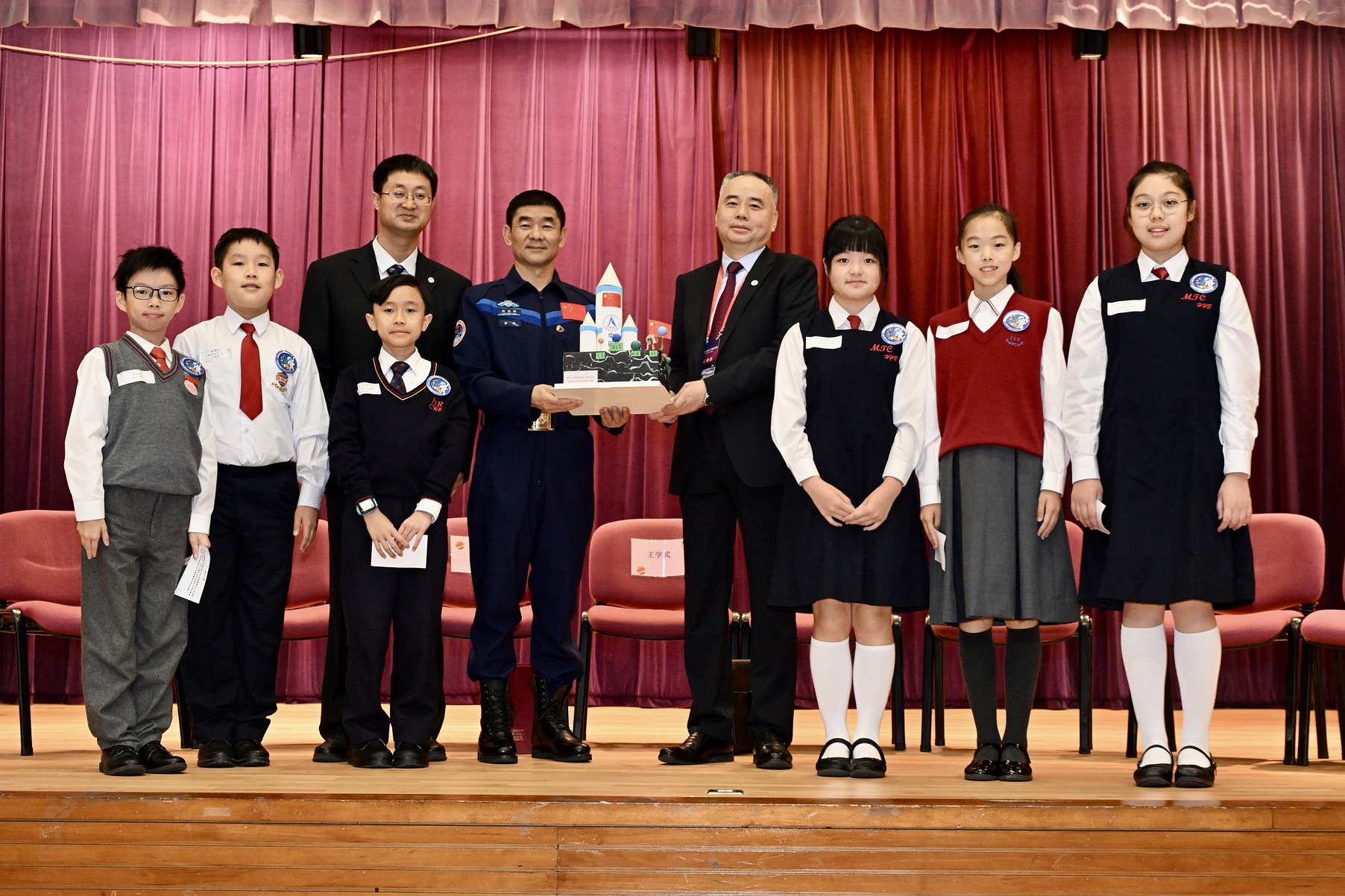中国载人航天工程代表团11月29日继续在港访问,图示(右四起)代表团成员王学武、神舟十二号乘组航天员刘伯明和代表团成员钟红恩出席在马头涌官立小学(红勘湾)举行的“中国载人航天工程代表团与中、小学生真情对话”活动。