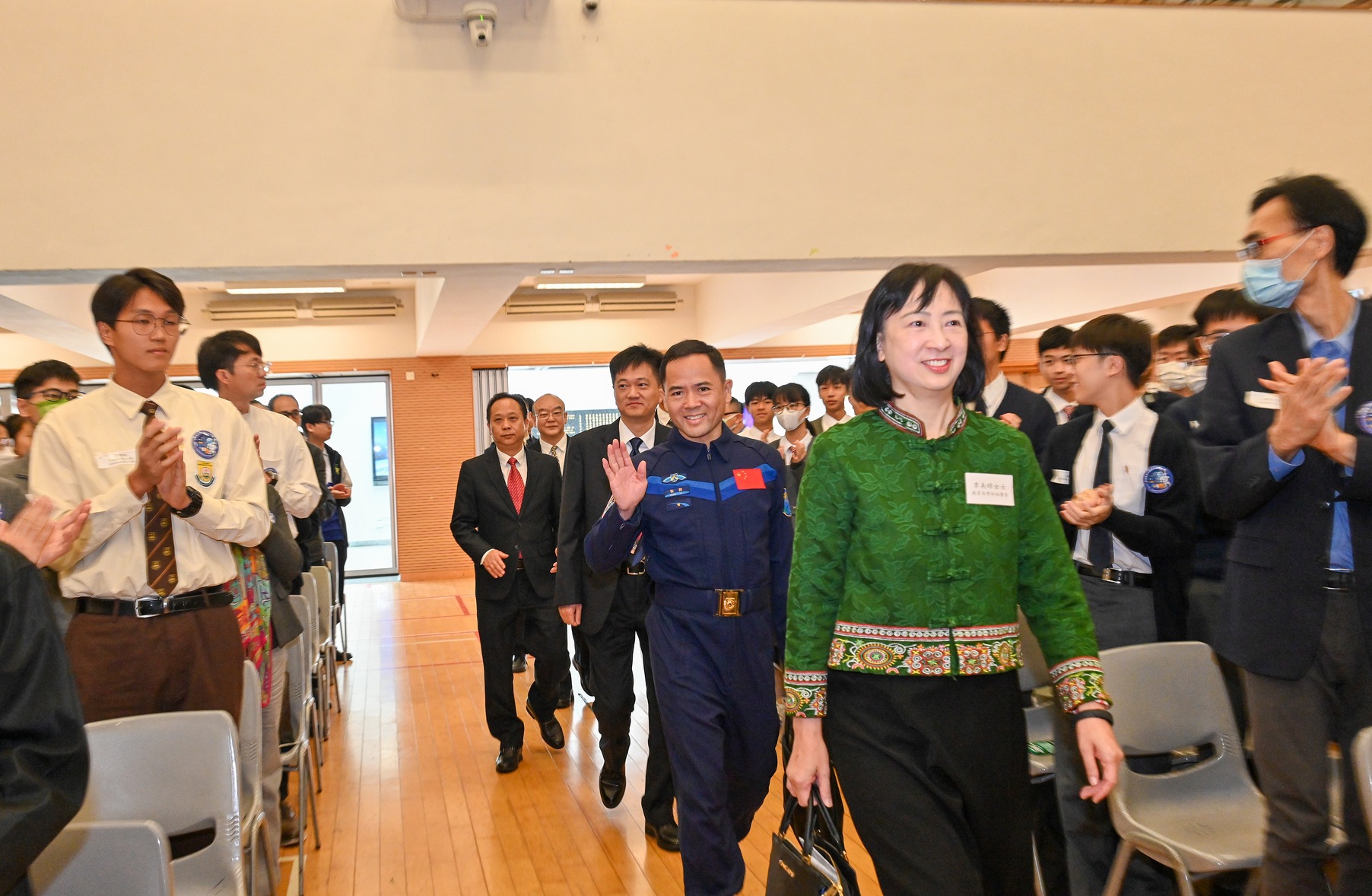 中国载人航天工程代表团11月29日继续在港访问,图示(右三起)香港特区教育局常任秘书长李美嫦、神舟十五号乘组航天员张陆和代表团成员出席在香港浸会大学附属学校王锦辉中小学(中学部)举行的“中国载人航天工程代表团与中、小学生真情对话”活动。