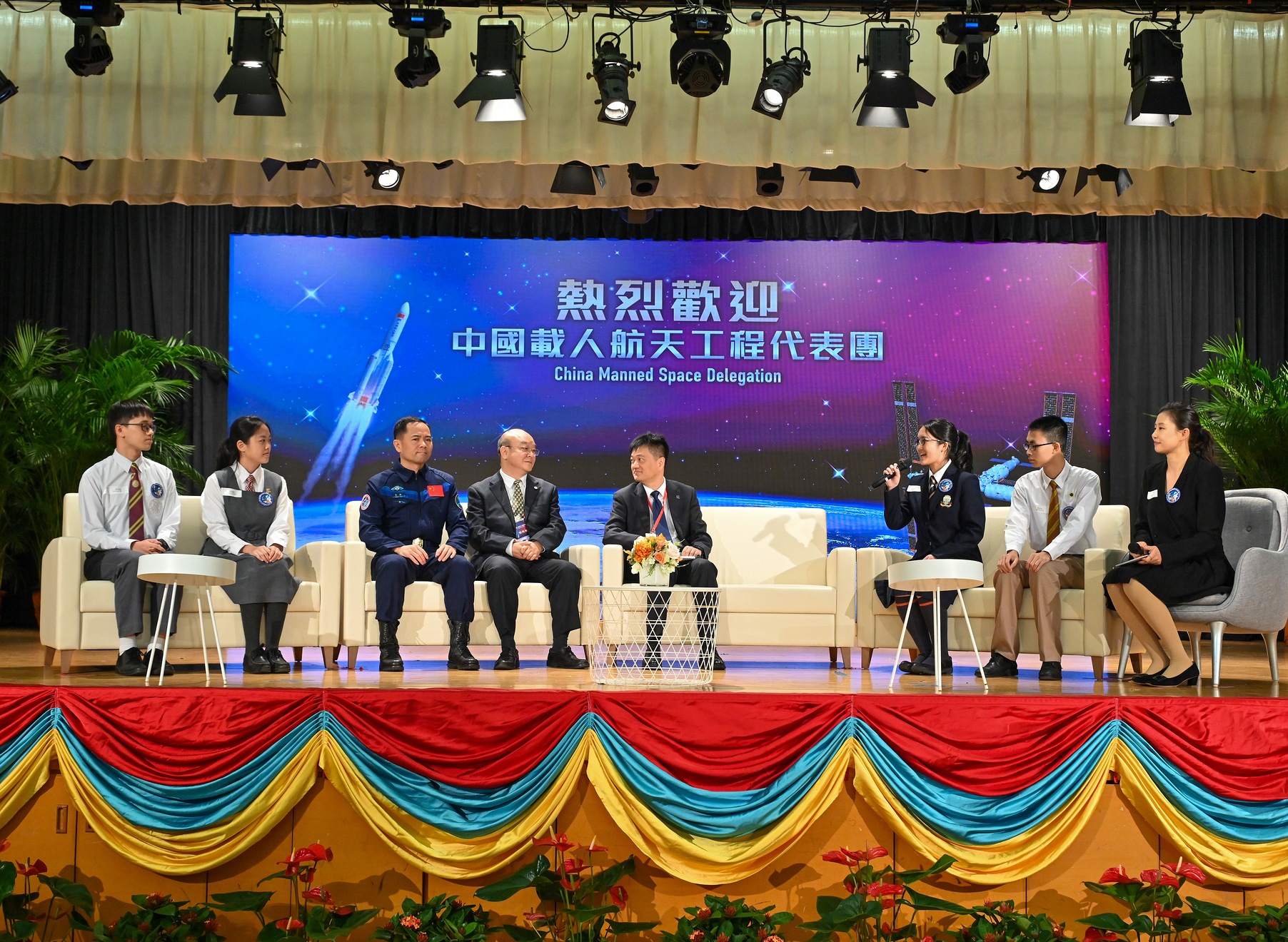 中国载人航天工程代表团11月29日继续在港访问,图示神舟十五号乘组航天员张陆(左三)和代表团成员出席在香港浸会大学附属学校王锦辉中小学(中学部)举行的“中国载人航天工程代表团与中、小学生真情对话”活动。