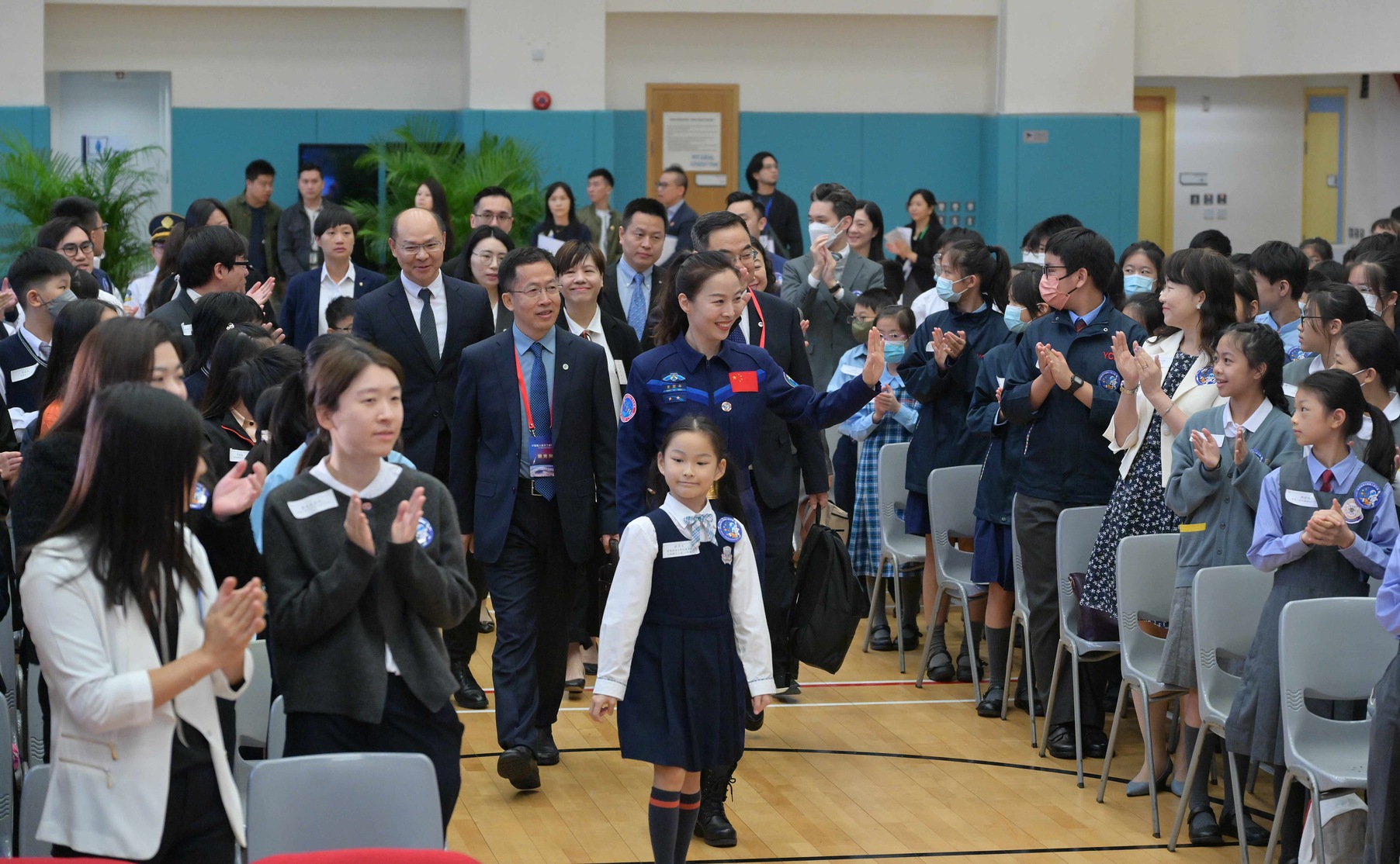 中国载人航天工程代表团11月29日继续在港访问,图示神舟十三号乘组航天员王亚平(第二排右一)和代表团成员出席在香港浸会大学附属学校王锦辉中小学(小学部)举行的“中国载人航天工程代表团与中、小学生真情对话”活动。
