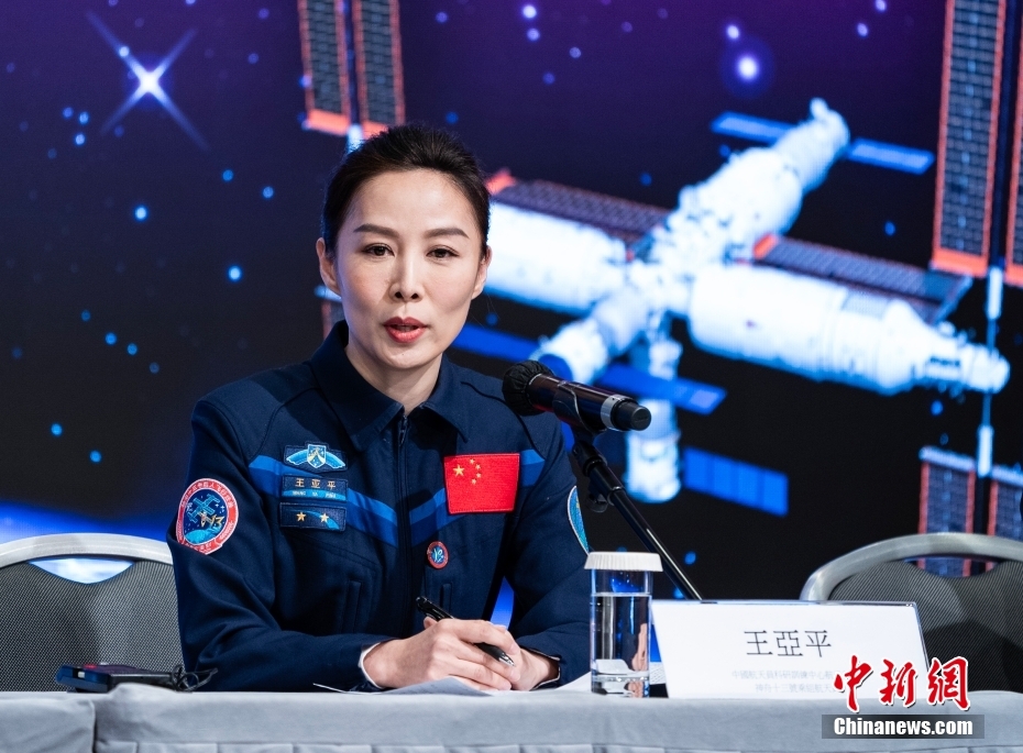 11月28日,抵达香港访问的载人航天工程代表团在香港会展中心举行媒体见面会。图为神舟十三号乘组航天员代表王亚平回答记者提问。中新社记者 侯宇 摄