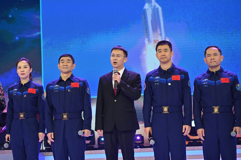 中国载人航天工程代表团11月29日继续在港进行访问,并出席在香港体育馆举行的全港欢迎中国载人航天工程代表团大汇演。图示(左起)神舟十三号乘组航天员王亚平、神舟十二号乘组航天员刘伯明、代表团团长、中国载人航天工程办公室副主任林西强、神舟十四号乘组指令长陈冬和神舟十五号乘组航天员张陆与观众见面。