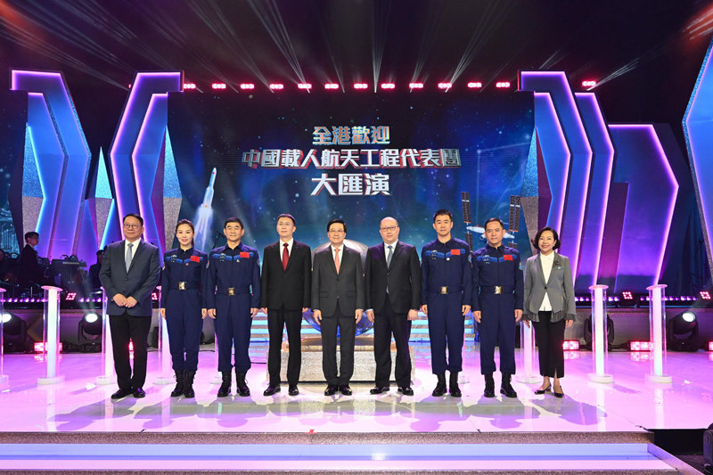 中国载人航天工程代表团11月29日继续在港进行访问,并出席在香港体育馆举行的全港欢迎中国载人航天工程代表团大汇演。图示(左起)政务司司长陈国基、神舟十三号乘组航天员王亚平、神舟十二号乘组航天员刘伯明、代表团团长、中国载人航天工程办公室副主任林西强、行政长官李家超、中央人民政府驻香港特别行政区联络办公室主任郑雁雄、神舟十四号乘组指令长陈冬、神舟十五号乘组航天员张陆和民政及青年事务局局长麦美娟在大汇演合照。