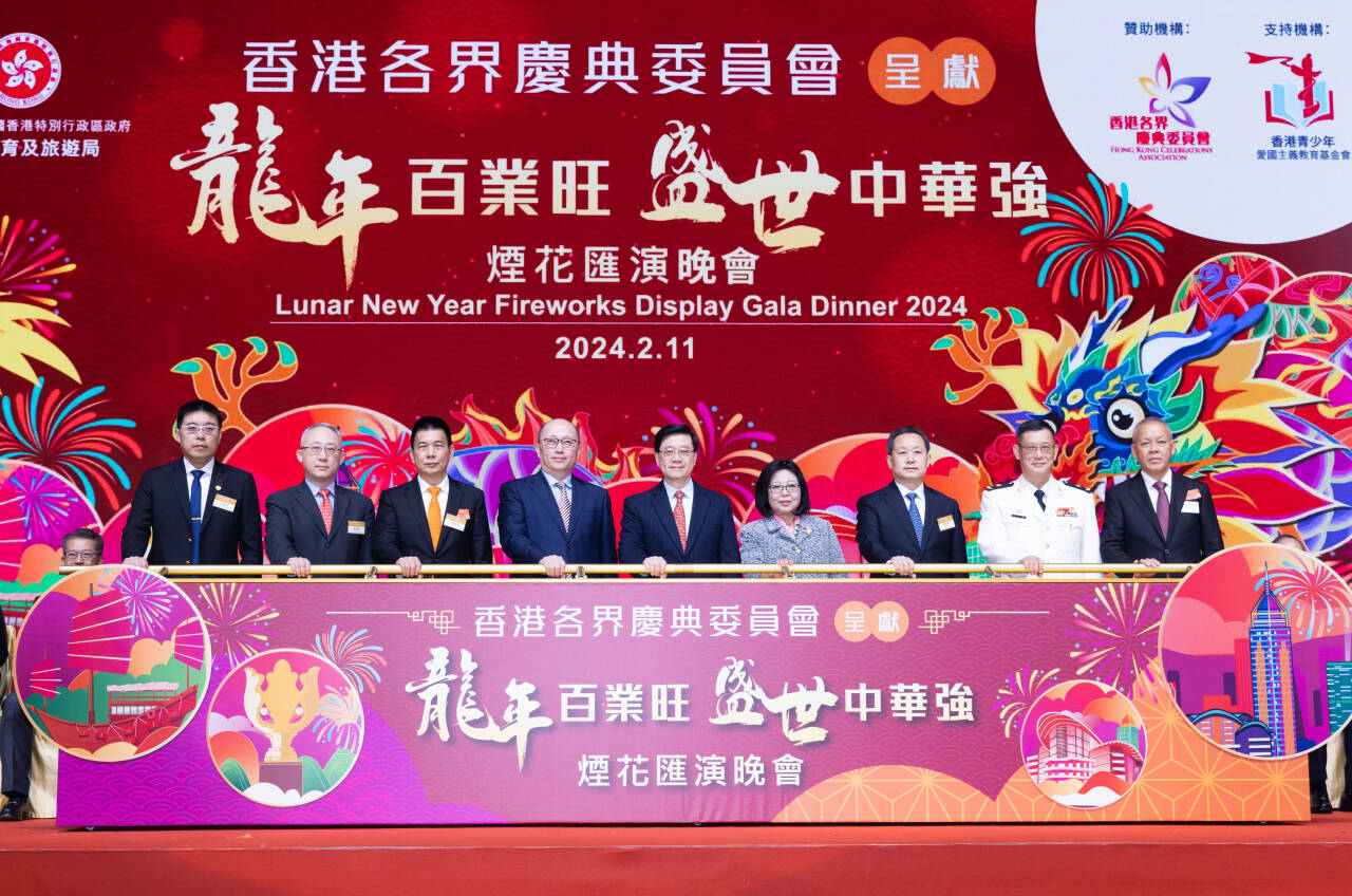 中央政府驻港联络办副主任刘光源、罗永纲、何靖、尹宗华及秘书长王松苗出席活动。龙年春节期间,香港社会各界将举办系列庆?;疃?,好戏连台,精彩纷呈,为市民和游客送上新春祝福,将节日氛围不断推向高潮。