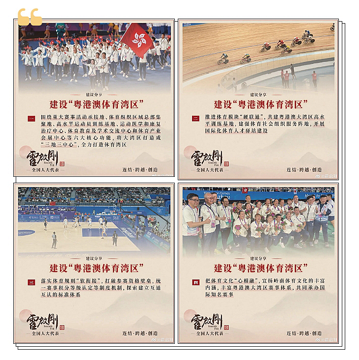 霍启刚建议,借助粤港澳三地联合举办全运会的契机,对接好软硬件资源,促进制度整合,加快推进“粤港澳体育湾区”建设。