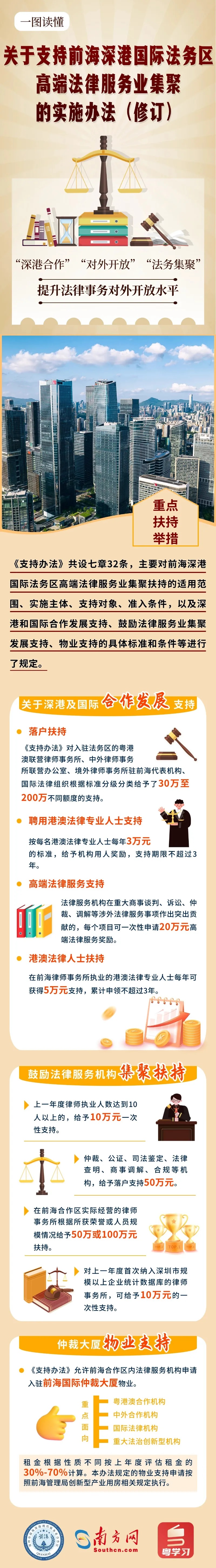 近日,深圳市前海管理局印发《深圳市前海深港现代服务业合作区管理局关于支持前海深港国际法务区高端法律服务业集聚的实施办法(修订)》(以下简称《办法》),自今年6月1日起实施,有效期3年。