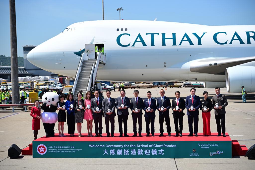 9月26日,第三对中央赠港大熊猫“安安”“可可”搭乘专机抵达香港国际机场,随后换乘专车抵达位于香港海洋公园的新家。当日,在香港国际机场,嘉宾在欢迎仪式现场合影。新华社记者 朱炜 摄